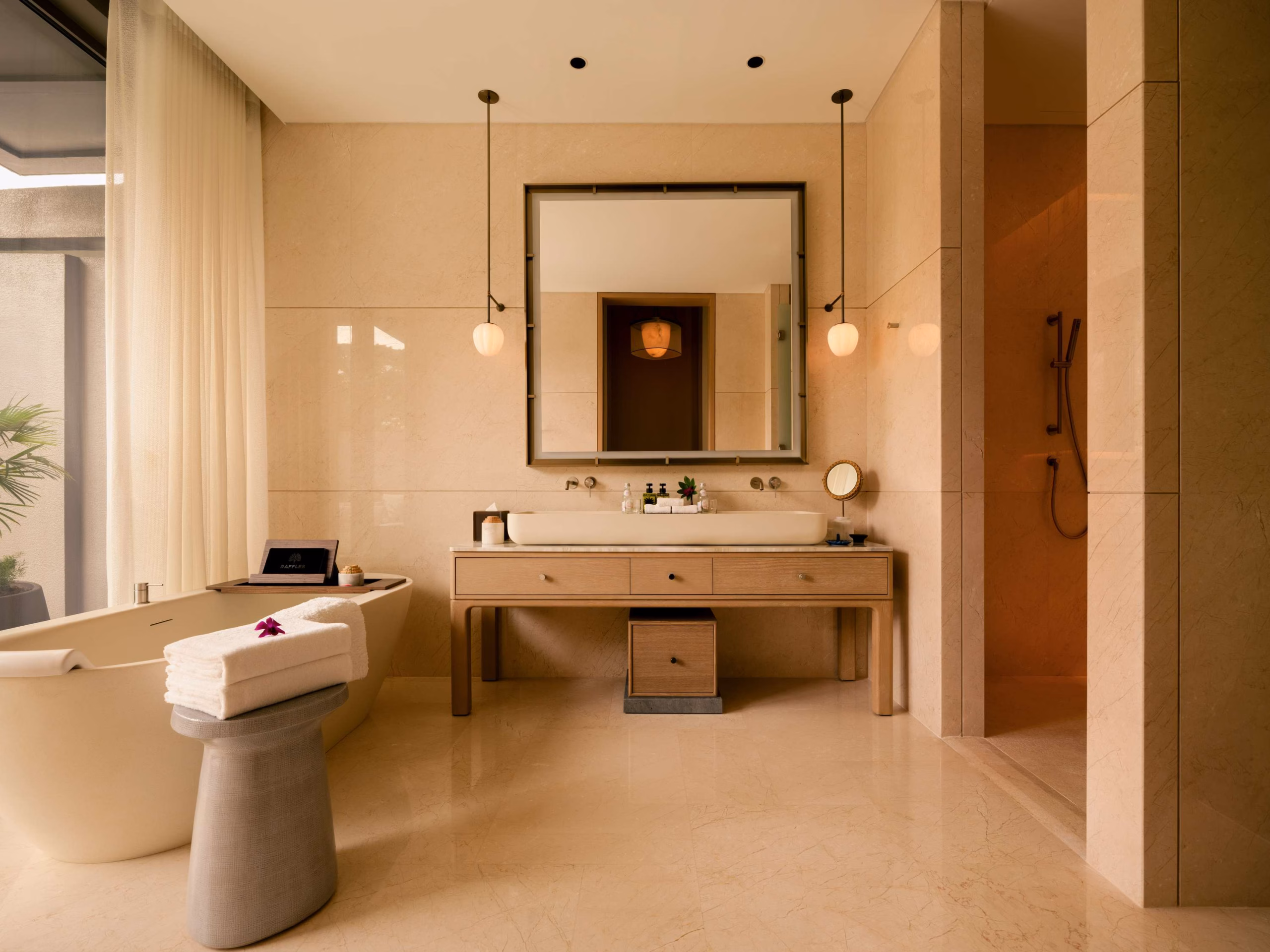 Integral to the guest experience, The Red Sea EDITION features the Allegra collection and bespoke apaiserMarble® bathware pieces in Glacier.
